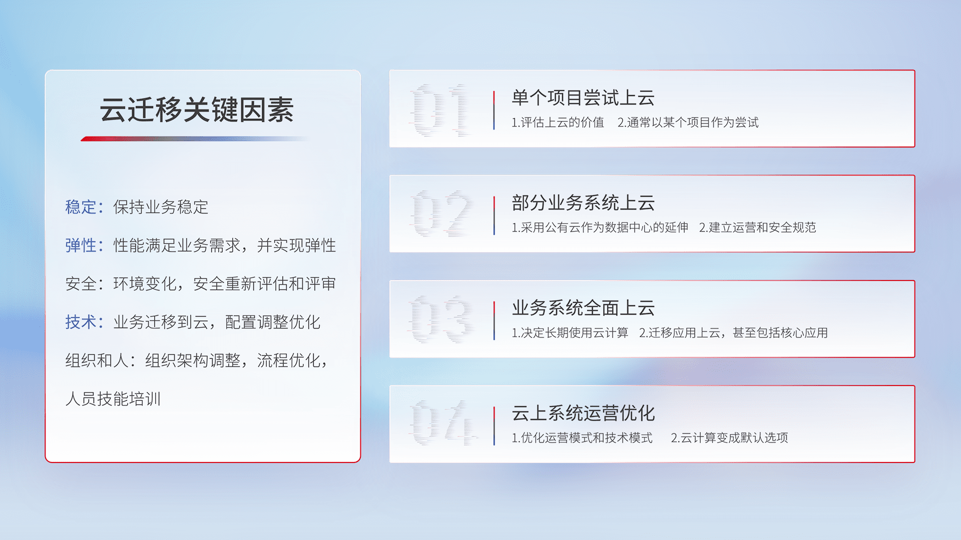 结合实际业务,,,,从规划设计、、云平台选型、、云原生改造、、、、数据迁移、、、、集成交付,,迁移全过程为客户识别最佳上云路径,,,做好风险识别管理,,,设计网络架构、、、身份权限、、、、安全审计合规、、、操作审计、、、、日志审计、、监控告警策略、、多站点容灾设计等,,对云上基础设施进行整体规划,,,,提升IT治理水平,,,,以满足弹性、、、高可用、、、高性能的需求。。。。