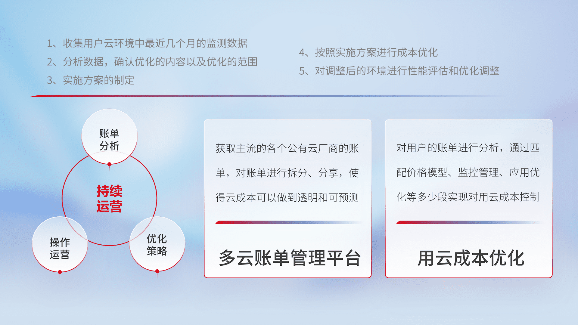 通过多云纳管,,以统一的资源数据模型把客户的云资源进行抽象和封装,,,进而实现对多云资源的统一操作,,保障云资源管理的可靠性、、稳定性与可用性。。量身定制化运维内容,,配置、、、开发运维、、补丁管理、、、备份、、监控、、、、认证和访问管理、、、审计和日常巡检等,,保障在用云过程中的可靠度,,,,稳定度以及高可用率。。。。